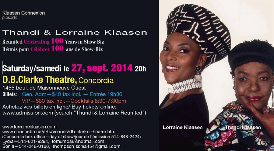 South African Montreal Queen Lorraine Klaasen and legendary South African Jazz singer Thandie Klaasen celebrated a total of 100 years in the music industry on the 27th of sept 2014 at the DB Clarke Theatre, Concordia University.